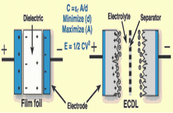 圖2 在結構上,超級電容器和電池或電解電容器的主要區(qū)別是電極材料