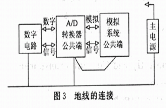 數(shù)字地線通常有很大的噪聲,而且有大的電流尖峰,所有的模擬公共地線應(yīng)該和數(shù)字公共地線分開走線,然后只在一點(diǎn)匯集在一處,如圖3所示,這種接法使模擬和數(shù)字地線間的公共阻抗最小。