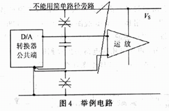 圖4說明這樣一種方法,他應(yīng)用于模擬量輸出運(yùn)算放大器對(duì)于數(shù)/模轉(zhuǎn)換器數(shù)字驅(qū)動(dòng)噪聲的去耦,如果旁路電容隨意地直接接到電源的兩根母線之間,旁路電容起不到應(yīng)有的作用,甚至可能有害,他從"不干凈"的到"清潔"的Vs,為噪聲提供低阻抗的交流通路。