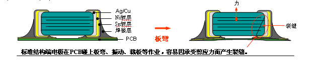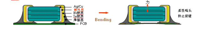 - 為電容端電極增加“彈性層”有效吸收外應(yīng)力,降低裂縫的發(fā)生機率
