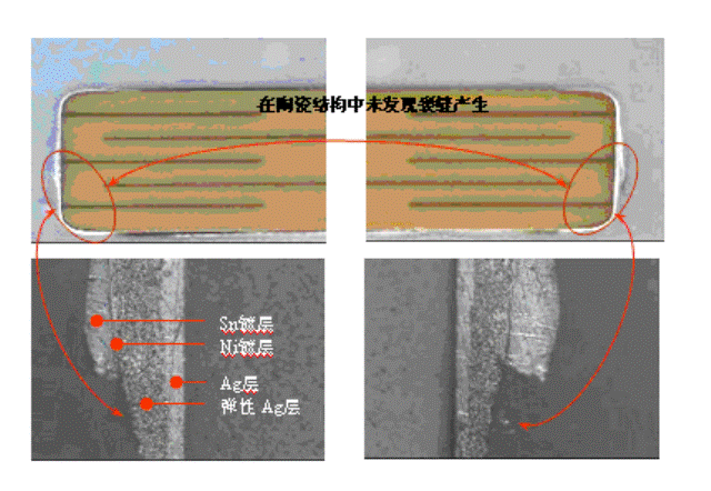 柔性端頭SuperTerm系列產(chǎn)品在板彎測試中產(chǎn)生破壞時,其破壞模式是開路模式,而。一般端電極開路或短路模式都會產(chǎn)生 。柔性端頭SuperTerm系列中的彈性層可從剖面圖中看見,其成份中含有〝高分子銀〞以產(chǎn)生此彈性效果。