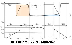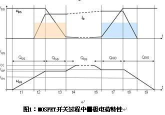 功率MOSFET管的柵極電荷特性如圖1所示,此特性圖可以在MOSFET數據表中查到,開通的工作過程可以參閱相關的文獻。值得注意的是:下面的開通過程對應著BUCK變換器上管的開通狀態(tài),對于下管是0電壓開通,因此開關損耗很小,可以忽略不計。