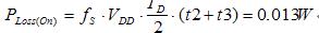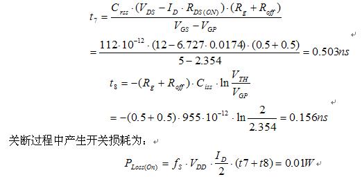 MOSFET開通損耗主要發(fā)生t2和t3時間段。下面以一個具體的實例下計算。輸入電壓12V,輸出電壓3.3V/6A,開關頻率350kHz,PWM柵極驅動器電壓為5V,導通電阻1.5Ohm,關斷的下拉電阻為0.5Ohm,所用的MOSFET為AO4468,具體參數如下:Ciss= 955pF,Coss= 145pF,Crss= 112pF,Rg= 0.5Ohm;當VGS= 4.5V,Qg= 9nC;當VGS=10V,Qg= 17nC,Qgd= 4.7nC,Qgs= 3.4nC;當VGS=5V且ID=11.6A,跨導gFS= 19S;當VDS=VGS且ID=250uA,,VTH= 2V;當VGS= 4.5V且ID=10A,RDS(ON)=17.4mOhm。