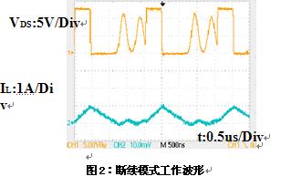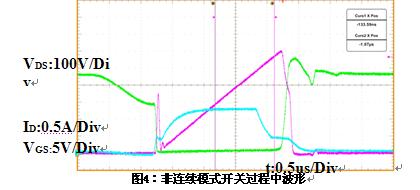 注意到圖1是基于連續(xù)電流模式下所得到的波形,對于非連續(xù)模式,由于開通前的電流為0,所以,除了Coss放電產生的功耗外,沒有開關的損耗,即非連續(xù)模式下開通損耗為0。但在實際的檢測中,非連續(xù)模式下仍然可以看到VGS有米勒平臺,這主要是由于Coss的放電電流產生的。Coss放電快,持續(xù)的時間短,這樣電流迅速降低,由于VGS和ID的受轉移特性的約束,所以當電流突然降低時,VGS也會降低,VGS波形前沿的米勒平臺處產生一個下降的凹坑,并伴隨著振蕩。