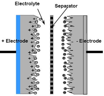 超級(jí)電容器可以被視為在兩個(gè)極板外加電壓時(shí)被電解液隔開(kāi)的兩個(gè)互不相關(guān)的多孔板。對(duì)正極板施加的電勢(shì)吸引電解液中的負(fù)離子,而負(fù)面板電勢(shì)吸引正離子。這有效地創(chuàng)建了兩個(gè)電荷儲(chǔ)層,在正極板分離出一層,并在負(fù)極板分離出另外一層。