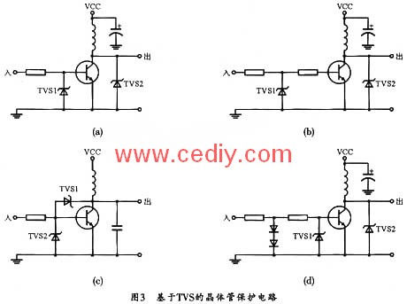 各種瞬變電壓能使晶體管的EB結(jié)或CE結(jié)擊穿而損壞,特別是晶體管集電極有感性(線圈、變壓器、電動(dòng)機(jī))負(fù)載時(shí),通常會(huì)產(chǎn)生高壓反電勢(shì),因而可能使晶體管損壞。在實(shí)際應(yīng)用中,建議采用TVS作為保護(hù)器件。圖3所示為T(mén)VS保護(hù)晶體管的四種電路實(shí)例。