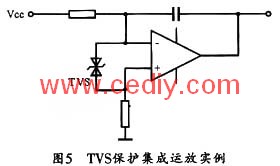 集成運(yùn)放對(duì)外界電應(yīng)力非常敏感。因此,在使用運(yùn)放的過(guò)程中,如果因操作失誤或采取了不正常的工作條件,往往會(huì)出現(xiàn)過(guò)大的電壓或電流,特別是浪涌和靜電脈沖,從而很容易使運(yùn)放受損或失效。圖5所示是用TVS在運(yùn)放差模輸入端防止過(guò)壓損傷的保護(hù)電路。