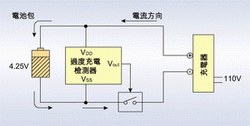 過(guò)度充電保護(hù)IC的原理為:當(dāng)外部充電器對(duì)鋰電池充電時(shí),為防止因溫度上升所導(dǎo)致的內(nèi)壓上升,需終止充電狀態(tài)。此時(shí),保護(hù)IC需檢測(cè)電池電壓,當(dāng)?shù)竭_(dá)4.25V時(shí)(假設(shè)電池過(guò)充點(diǎn)為4.25V)即激活過(guò)度充電保護(hù),將功率MOSFET由開(kāi)轉(zhuǎn)為切斷,進(jìn)而截止充電。