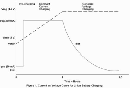 由于MSP430F20X3系列的指令速度可達(dá)16MIPS,且SD_16的采樣速度為4kSPS,而且電池電壓/電流/溫度變化緩慢,因此對(duì)電池組中單節(jié)電池電壓/電流/溫度檢測采用輪回檢測即可完全滿足系統(tǒng)設(shè)計(jì)需要;16位的高精度保證了對(duì)每節(jié)電池溫度、恒流、恒壓等要求的準(zhǔn)確控制。對(duì)單節(jié)鋰電池充電的曲線如圖3。