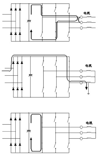 IGBT保護(hù)一般在硬件電路里實(shí)現(xiàn),根據(jù)要保護(hù)的過流條件的模式,具體電路和過流感測器件的類型會有所不同。其原因在于,在每個(gè)過流模式中的路徑和電流流動(dòng)是不一樣的。圖3a至3c顯示了每個(gè)過流條件模式的典型電流流動(dòng),在主要功率電路里的電流流動(dòng)及其路徑取決于過流的模式。在開關(guān)擊穿和線間短路條件下的短路電流總是流向直流總線上的電容器。然而,故障接地電流通常從交流線輸入,通過正直流總線和高側(cè)IGBT,流向故障發(fā)生的接地點(diǎn)。沒有電流流過總線電容器。