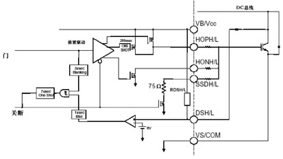 在DSH/L針腳提供主動(dòng)式偏壓結(jié)構(gòu),目的是降低IGBT處于OFF時(shí)流過二極管寄生電容和內(nèi)部上拉電阻電流的噪聲效應(yīng)。DSH/L給VB/VCC提供相應(yīng)的主動(dòng)式上拉,給VS/COM提供相應(yīng)的下拉。當(dāng)電壓超過VDESAT臨界電壓的時(shí)候,專用偏壓電路可以降低DSH/L針腳的阻抗。當(dāng)IGBT處于完全開啟的時(shí)候,感測二極管變?yōu)轫樒珼SH/L針腳上的電壓就下降了。這時(shí),偏壓電路不再起作用,目的是降低二極管的偏壓電流。