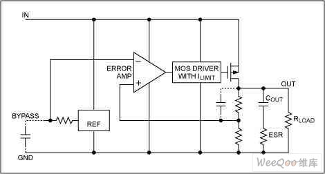 低壓差線性穩(wěn)壓器(LDO)的結(jié)構(gòu)主要包括啟動(dòng)電路、恒流源偏置單元、使能電路、調(diào)整元件、基準(zhǔn)源、誤差放大器、反饋電阻網(wǎng)絡(luò),保護(hù)電路等,基本工作原理是這樣的:系統(tǒng)加電,如果使能腳處于高電平時(shí),電路開(kāi)始啟動(dòng),恒流源電路給整個(gè)電路提供偏置,基準(zhǔn)源電壓快速建立,輸出隨著輸入不斷上升,當(dāng)輸出即將達(dá)到規(guī)定值時(shí),由反饋網(wǎng)絡(luò)得到的輸出反饋電壓也接近于基準(zhǔn)電壓值,此時(shí)誤差放大器將輸出反饋電壓和基準(zhǔn)電壓之間的誤差小信號(hào)進(jìn)行放大,再經(jīng)調(diào)整管放大到輸出,從而形成負(fù)反饋,保證了輸出電壓穩(wěn)定在規(guī)定值上;同理如果輸入電壓變化或輸出電流變化,這個(gè)閉環(huán)回路將使輸出電壓保持不變,即: