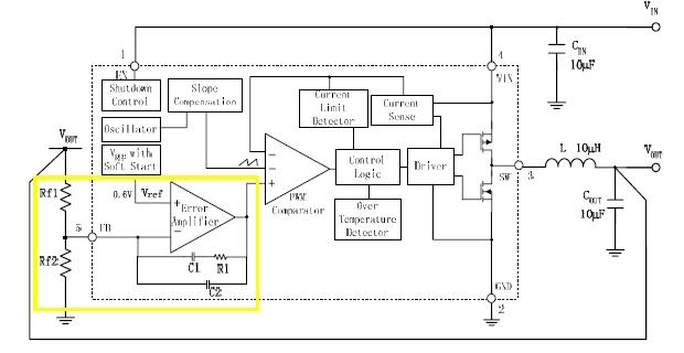 為了實(shí)現(xiàn)系統(tǒng)的抗干擾能力,Buck變換器除了主功率部分以外,還會(huì)有相應(yīng)的負(fù)反饋控制電路,補(bǔ)償網(wǎng)絡(luò)是反饋控制電路的一部分。補(bǔ)償網(wǎng)絡(luò)的加入可以提高環(huán)路的低頻增益,從而提高抗干擾能力;同時(shí)補(bǔ)償網(wǎng)路使系統(tǒng)擁有足夠的相位裕度,從而保證系統(tǒng)處于穩(wěn)定的工作狀態(tài),不會(huì)振蕩。圖2中黃色框內(nèi)的部分就是補(bǔ)償網(wǎng)絡(luò)部分,補(bǔ)償網(wǎng)絡(luò)中包括 R1,C1,C2和Rf1(注:Rf2在環(huán)路分析中不起作用),補(bǔ)償網(wǎng)絡(luò)的傳遞函數(shù)可以表示為: