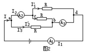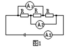 如圖1所示,三個(gè)電阻的阻值相等,電流表A1、A2和A3的內(nèi)電阻均可忽略,它們的示數(shù)分別為I1、I2和I3,則I1:I2:I3=______:______:______.
