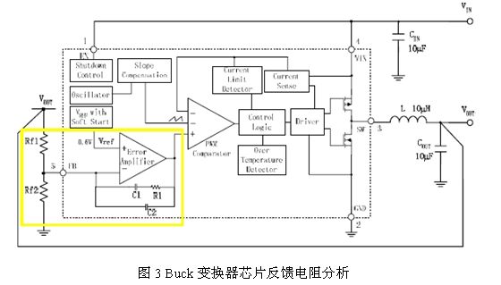 Buck變換器由于具有效率高的優(yōu)點(diǎn)而被廣泛應(yīng)用于手機(jī)、GPS、MP3等移動(dòng)多媒體設(shè)備上,目前很多電源管理芯片制造廠商都推出了不同電流能力的Buck變換器,這類變 換器雖然在電流能力和保護(hù)功能方面存在一些差異,但是他們電路的主框架結(jié)構(gòu)是基本一致的,主要可以分為兩個(gè)部分:一是實(shí)現(xiàn)電能轉(zhuǎn)換的主功率部分,另一部分 是實(shí)現(xiàn)負(fù)反饋控制的控制電路。下圖是BCD半導(dǎo)體公司的Buck變換器AP3406的典型應(yīng)用圖,黃色框里是對(duì)反饋電阻的作用做簡(jiǎn)要分析。