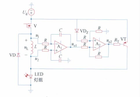 LED 燈組為n 個(gè)大功率LED 串聯(lián)連接,UO =nUF為L(zhǎng)ED 燈組壓降; UF為單個(gè)LED 的導(dǎo)通壓降。