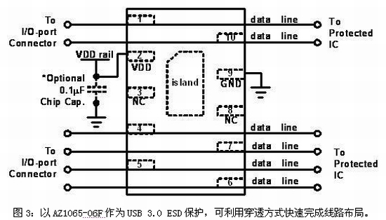 AZ1065系列產(chǎn)品提供了六個(gè)極低電容的引腳,可同時(shí)保護(hù)USB 3.0的兩組差動(dòng)對(duì)(TX和RX)及USB 2.0的差動(dòng)對(duì)(D+和D-),具有減小PCB面積和降低布局復(fù)雜度等優(yōu)點(diǎn),并可大幅節(jié)省系統(tǒng)成本。更特別的是,AZ1065-06F率先采用交錯(cuò)型的引腳,以便PCB布局時(shí)可利用穿透式(Feedthrough)方式實(shí)現(xiàn)完美設(shè)計(jì),圖3顯示了AZ1065-06F的接線方式。