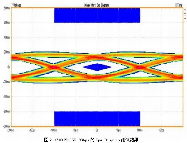 在IEC 61000-4-2接觸模式6kV(TLP電流等效約為17A)的ESD攻擊下,箝制電壓僅有13.4V,足以有效避免系統(tǒng)產(chǎn)品在靜電測(cè)試時(shí)發(fā)生數(shù)據(jù)錯(cuò)誤、當(dāng)機(jī)甚至損壞的情況。圖2所示為裝有ESD保護(hù)組件AZ1065-06F的USB 3.0端口順利通過5Gbps的眼圖測(cè)試結(jié)果。