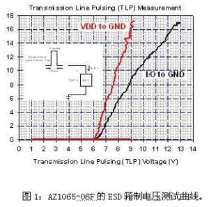 最重要是,與相同的寄生電容相比,AZ1065擁有最低的ESD箝制電壓,可有效防止數(shù)據(jù)傳輸時(shí)被ESD事件干擾,這樣才能讓具有USB 3.0連接端口的電子系統(tǒng)得以通過Class-A的IEC 61000-4-2系統(tǒng)級(jí)靜電放電保護(hù)測(cè)試。利用傳輸線脈沖系統(tǒng)(TLP)測(cè)量AZ1065-06F后,可以觀察到如圖1所示的ESD箝制電壓特性。