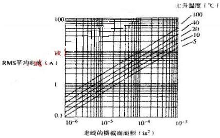 圖2描述了最大的功率輸送能力和溫度上升的關(guān)系。在圖2中,水平軸顯示的是橫截面面積,單位為IN的2次方,縱軸顯示的是該線在給定升溫值時(shí)的允許電流。