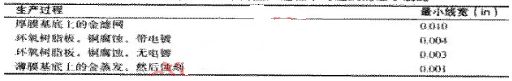 走線寬度上的第二個(gè)不太重要的限制來(lái)自生產(chǎn)制造過(guò)程。表1列出了在各種不同的生產(chǎn)過(guò)程中可達(dá)到的最小走線寬度。