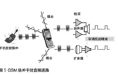 當(dāng)手機(jī)與基站通訊,或兩個(gè)手機(jī)彼此接近時(shí),發(fā)射脈沖通過(guò)擴(kuò)音器,揚(yáng)聲器,或頭戴式耳機(jī)線傳人音頻通路。見圖5。