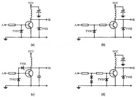 各種瞬變電壓能使晶體管的EB結(jié)或CE結(jié)擊穿而損壞,特別是晶體管集電極有感性(線圈、變壓器、電動機(jī))負(fù)載時,通常會產(chǎn)生高壓反電勢,因而可能使晶體管損壞。在實際應(yīng)用中,建議采用TVS作為保護(hù)器件。圖3所示為TVS保護(hù)晶體管的四種電路實例。