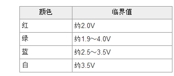 LED具有一般硅二極管的類似特性,在正負(fù)極之間施加電壓。當(dāng)外加電壓達(dá)到一個(gè)臨界值,LED中產(chǎn)生電流,開始發(fā)光。當(dāng)電壓超過這個(gè)臨界值時(shí),電流急劇增加。白色LED的臨界電壓值約3.5V。紅色、綠色、藍(lán)色的LED臨界電壓值如表1所示。