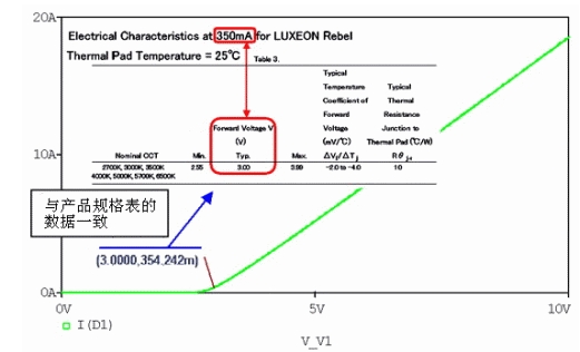 我們用電路仿真來說明LED的電子特性以及驅(qū)動(dòng)電路。電路仿真是對(duì)LED和電阻等的電子設(shè)計(jì)進(jìn)行建模并在計(jì)算機(jī)上模擬計(jì)算電路運(yùn)行的一種簡(jiǎn)易方法。這里使用的是Cadence公司的電路仿真PSpice A/D。同時(shí)使用了飛利浦照明公司的LUXEON系列LX3-PW71。