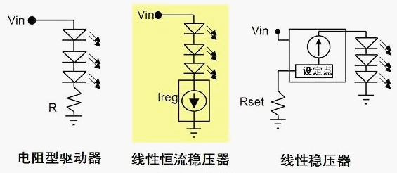 例如在采用DC-DC電源的LED照明應(yīng)用中,可以采用的LED驅(qū)動(dòng)方式有電阻型、線性穩(wěn)壓器及開關(guān)穩(wěn)壓器等,基本的應(yīng)用示意圖見圖7。