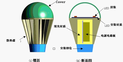 要避免電子設(shè)備的發(fā)熱有多種方法。比如,加散熱器,在熱源周圍安置能提供冷氣的風(fēng)扇。前者是通過增加散熱面積,來增加散熱的通道,后者是使熱不在熱源周圍聚集。但是,正如圖1 LED燈的概括圖所示,LED封裝時(shí)不能直接連接散熱器,也沒有安裝風(fēng)扇的位置。而且內(nèi)部電源電路板也會(huì)產(chǎn)生熱量,因此LED燈的散熱問題可以說是一個(gè)非常棘手的問題。這樣,如何有效使用LED安裝材質(zhì)和散熱器就變得很重要。