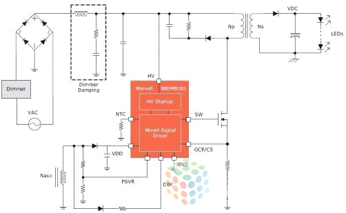 消費者用LED節(jié)能燈取代白熾燈等傳統(tǒng)照明解決方案的同時,也希望得到同樣或更好的照明體驗。不幸的是,他們常常發(fā)現(xiàn)LED燈在調(diào)光能力上有問題,因此覺得LED燈幾乎不能調(diào)光或調(diào)光時會閃爍。很多LED燈與家中已安裝的壁式調(diào)光器也不兼容。Marvell最新的88EM8183深度調(diào)光單級交流/直流 LED驅(qū)動器IC為OEM廠商和ODM廠商提供了兼容性最廣泛的調(diào)光解決方案,該IC與全球市場上絕大多數(shù)調(diào)光器都兼容,而且提供卓越的光輸出質(zhì)量,可提高消費者的滿意度,減少退貨。