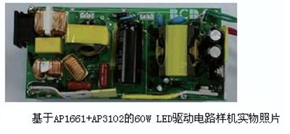 AP1661是一款工作于臨界導(dǎo)通模式下的有源功率因數(shù)校正控制芯片,可廣泛應(yīng)用于開關(guān)電源、LED驅(qū)動(dòng)和電子鎮(zhèn)流器的預(yù)調(diào)整變換器控制。該芯 片內(nèi)部包括1個(gè)啟動(dòng)定時(shí)器可滿足待機(jī)應(yīng)用要求,1個(gè)能實(shí)現(xiàn)接近于1的功率因數(shù)的單象限乘法器和1個(gè)零電流檢測(cè)模塊確保臨界斷續(xù)方式工作。AP1661的圖 騰柱驅(qū)動(dòng)輸出能夠?yàn)橥獠縈OSFET或IGBT提供最大600mA驅(qū)動(dòng)電流和800mA關(guān)斷電流能力。采用了先進(jìn)的雙極型互補(bǔ)金屬氧化物半導(dǎo)體設(shè)計(jì)和制造 工藝,具有低啟動(dòng)電流,低工作電流和低功耗的特點(diǎn)。AP1661同時(shí)具有完善的保護(hù)功能,包括過(guò)壓保護(hù)、帶有滯后的輸入欠壓鎖定和乘法器輸出嵌位以限制開 關(guān)最大峰值電流。圖7為該方案60W應(yīng)用電路樣機(jī)實(shí)物照片。圖8為應(yīng)用該方案LED直管燈實(shí)物照片。