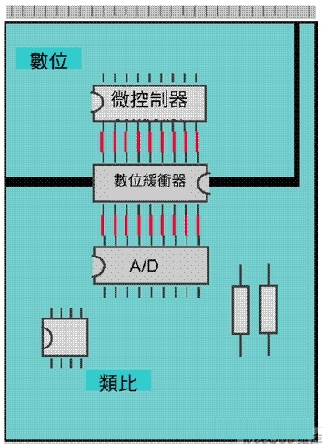 圖注: 使用高分辨率 SAR 模擬數(shù)字轉(zhuǎn)換器,轉(zhuǎn)換器電源與接地應(yīng)連接至模擬面。模擬數(shù)字轉(zhuǎn)換器的數(shù)字輸出應(yīng)有緩沖器,使用外部三態(tài)輸出緩沖器。這些緩沖器隔開(kāi)模擬面與數(shù)字面,并提供高驅(qū)動(dòng)能力。