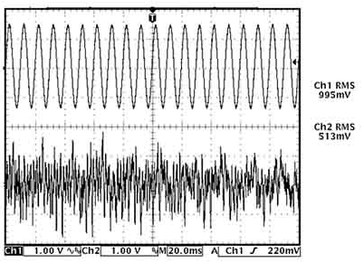 常見的音源,包含樂音和語音,其RMS值往往比峰值輸出功率低得多。通常情況下,語音的峰值與RMS功率之比(即波峰因數(shù))為12dB,而樂音的波峰因數(shù)為 18~20dB。圖1為時域內(nèi)音頻信號和正弦波的波形圖,給出了采用示波器測量兩者RMS值的結(jié)果。雖然音頻信號峰值略高于正弦波,但其RMS值大概只有正弦波的一半。同樣,音頻信號可能存在突變,但正如測量結(jié)果所示,其平均值仍遠低于正弦波。雖然音頻信號可能具有與正弦波相近的峰值,但D類放大器表現(xiàn)出來的熱效應(yīng)卻大大低于正弦波。因此,測量系統(tǒng)的熱性能時,最好使用實際音頻信號而非正弦波作為信號源。如果只能使用正弦波,則所得到的熱性能要比實際系統(tǒng)差。
