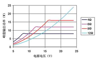 D 類放大器MOSFET輸出級的導(dǎo)通電阻會影響它的效率和峰值電流能力。降低負載的峰值電流可減少MOSFET的I2R損耗,進而提高效率。要降低峰值電流,應(yīng)在保證輸出功率, D類放大器的電壓擺幅以及電源電壓的限制的條件下,選擇最大阻抗的揚聲器,如圖4所示。本例中,假設(shè)D類放大器的輸出電流為2A,電源電壓范圍為 5~24V。電源電壓大于等于8V時,4Ω的負載電流將達到2A,相應(yīng)的最大連續(xù)輸出功率為8W。如果8W的輸出功率能滿足要求,則可以考慮使用一個 12Ω揚聲器和15V供電電壓,此時的峰值電流限制在1.25A,對應(yīng)的最大連續(xù)輸出功率為9.4W。此外,12Ω負載的工作效率要比4Ω負載的高出 10%~15%。實際效率的提高根據(jù)不同D類放大器而異。雖然大多數(shù)揚聲器的阻抗都采用4Ω或8Ω,但也可采用其他阻抗的揚聲器實現(xiàn)更高效的散熱。