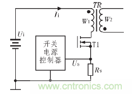開關(guān)電源從控制方式上可分為電壓控制型和電流控制型,從隔離變壓器的驅(qū)動(dòng)方式上可分為單端型和雙端型。在這些電路形式中, 許多形式的開關(guān)電源需要使用電流傳感器檢測電流,或者用于脈沖占空比的控制,或者用于電路的保護(hù)。電流控制型開關(guān)電源直接對輸入的脈沖電流進(jìn)行檢測,能同時(shí)根據(jù)輸入電壓和輸出電壓的變化綜合調(diào)節(jié)脈沖占空比,具有動(dòng)態(tài)響應(yīng)速度快,輸入電壓的波動(dòng)對輸出電壓影響小等特點(diǎn)。電流控制型開關(guān)電源中需要電流傳感器檢測輸入的脈沖電流, 以作為開關(guān)電源調(diào)節(jié)脈沖占空比、穩(wěn)定輸出電壓的反饋信號。圖1 所示為一個(gè)電流控制型的反激式開關(guān)電源的輸入通道原理圖。圖中電阻RS在電路中的作用即是電流傳感器, 在功率開關(guān)T1導(dǎo)通時(shí), 流過隔離變壓器原邊繞組W1的電流Ii將使RS上產(chǎn)生電壓降US,US即為向開關(guān)電源控制器反饋的輸入電流值信號。根據(jù)輸出電壓反饋信號和輸入電流值反饋信號US, 開關(guān)電源控制器將綜合調(diào)節(jié)電路的脈沖占空比,保證輸出電壓的穩(wěn)定。