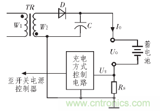 為了提高開關(guān)電源工作的可靠性,防止輸出電流過流等情況發(fā)生,許多開關(guān)電源在輸出端接入電流傳感器,檢測輸出電流的大小,一旦輸出電流超過設(shè)計(jì)標(biāo)準(zhǔn),保護(hù)電路即采取必要措施保護(hù)開關(guān)電源的安全[3]。此外,當(dāng)開關(guān)電源作為蓄電池充電器時(shí),也需要檢測輸出電流的大小,以此了解蓄電池的充電情況,適時(shí)切換充電方式,達(dá)到提高充電效率,延長蓄電池的使用壽命的效果。圖3 為一個(gè)蓄電池充電器的輸出電流檢測原理圖, 電流檢測電阻RS將蓄電池的充電電流轉(zhuǎn)化為電壓US,反饋給充電方式控制電路,由控制電路根據(jù)充電電流的大小適時(shí)切換充電方式[4]。