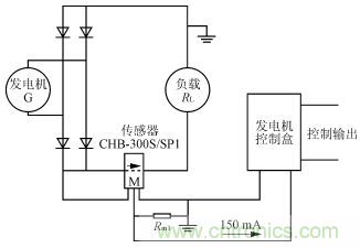 在某型地面車輛上裝備了一套獨立的大功率發(fā)電系統(tǒng),該發(fā)電系統(tǒng)設(shè)計選用了CHB-300S型閉環(huán)霍爾電流傳感器作為系統(tǒng)電流檢測部件,通過對傳感器的輸出信號進行處理,設(shè)定限流工作點,確保發(fā)電系統(tǒng)的輸出功率不高于發(fā)電機的額定功率。閉環(huán)霍爾電流傳感器CHB-300S的應(yīng)用,很好地實現(xiàn)了上述應(yīng)用目的。如圖3所示,發(fā)電機G輸出正端匯流母線穿過CHB-300S/SP1的原邊電流穿孔,由傳感器CHB-300S/SP1檢測發(fā)電機的輸出電流,傳感器的輸出IM與發(fā)電機控制盒相連,由發(fā)電機控制盒設(shè)定發(fā)電機的輸出電流控制點,依據(jù)此信號,對發(fā)電機的輸出電流加以限制,避免發(fā)電機因輸出功率過高而發(fā)生故障或損壞,從而保證發(fā)電系統(tǒng)正常工作。