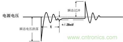 我們通常稱之為電源的負(fù)載瞬態(tài)恢復(fù)時(shí)間,或者瞬態(tài)響應(yīng)時(shí)間。它表征的是,當(dāng)負(fù)載電流發(fā)生突然變化的時(shí)候,電源電壓恢復(fù)到設(shè)定范圍內(nèi)所需要的時(shí)間。如圖2所示: