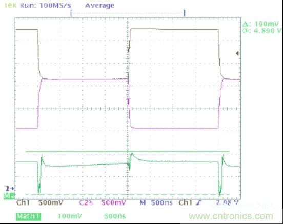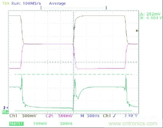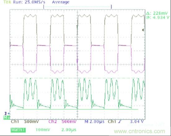 圖1中的波形顯示了一個(gè)可以在典型CAN收發(fā)器的輸出上觀察到的共模噪聲。在這幅圖像中,黑色軌跡線(通道1)顯示CANH,紫色軌跡線(通道 2)顯示的是CANL,并且綠色軌跡線(數(shù)據(jù)功能)是CANH與CANL的和。這個(gè)求和的過(guò)程給出了一個(gè)波形,它的值等于此時(shí)一個(gè)指定點(diǎn)上共模電壓的2 倍。