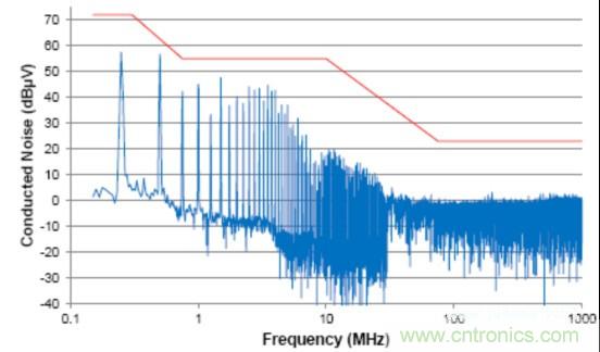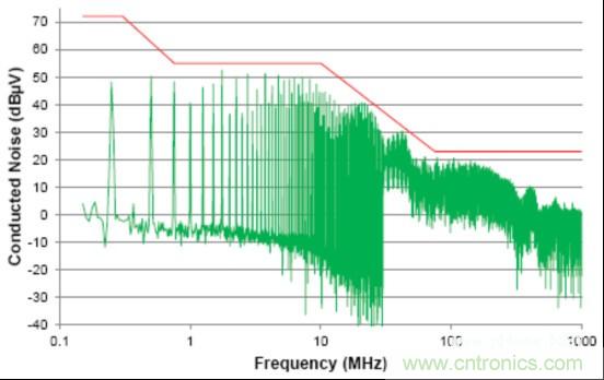 由于信號(hào)的共模部分能夠與系統(tǒng)(或與外部系統(tǒng))中的其它分量耦合在一起(通過(guò)輻射或傳導(dǎo)路徑),這個(gè)共模噪聲直接影響放射性能。這個(gè)器件的傳導(dǎo)放射按照工業(yè)電氣工程/電子 (IBEE) 茨維考技術(shù)的工程服務(wù)進(jìn)行測(cè)量;如圖2中所示,這個(gè)器件的傳導(dǎo)放射連同一個(gè)普通汽車原始設(shè)備制造商(OEM)限值線一同繪制。
