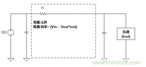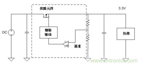 圖1. 線性穩(wěn)壓器框圖。注意,旁路元件將在其自身和負(fù)荷之間形成一個分壓器,起到耗散功率的作用。