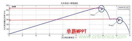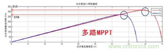 因?yàn)楣夥姵仃嚵惺菃挝还夥姵亟M串組成的,每個(gè)組串都有自己的工作電壓,電壓很大概率上不一致,如果以傳統(tǒng)的集中式方案的話,組串在匯流箱能量匯集時(shí)并聯(lián)會(huì)發(fā)生一次并聯(lián)失配,匯流箱到逆變器能量并聯(lián)時(shí)再發(fā)生一次并聯(lián)失配,嚴(yán)重影響光伏電池組件的發(fā)電效率。如下圖3所示,單路MPPT的情況下,光伏電池組件受到各種因素的影響,會(huì)導(dǎo)致出現(xiàn)兩個(gè)或多個(gè)波峰的情況,跟蹤到任何一個(gè)波峰都會(huì)對發(fā)電量造成損失。而如果多路MPPT的情況下,能精確跟蹤到每一個(gè)組串的特性,形成多條MPPT曲線,使得每串光伏電池組串最大效能的發(fā)揮作用。