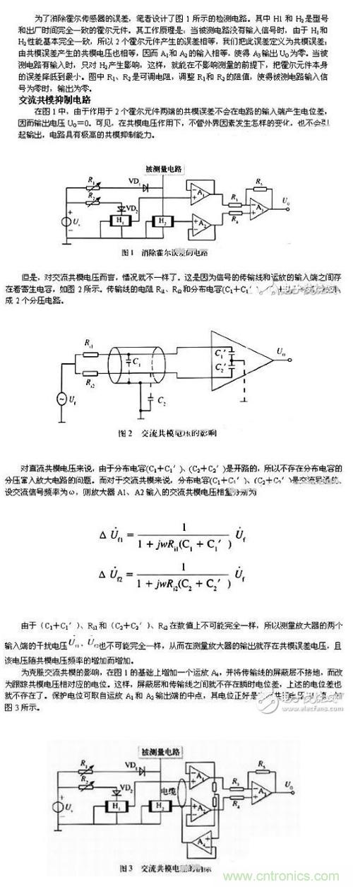 所取的電位經(jīng)運放A4組成的電壓跟隨器驅(qū)動電纜的屏蔽層,這樣就較好地抑制了交流共模電壓的干擾。圖3所示的電路,適用于各種傳感器電路。