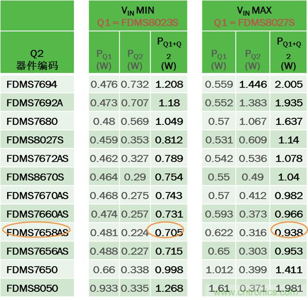 為優(yōu)化轉(zhuǎn)換器能效,首先根據(jù)VIN選擇損耗最小的Q1,然后選擇產(chǎn)生損耗最小的Q2。本例中, 無論VIN最小或最大,最佳的Q2是相同的,都為FDMS7658AS(但并不總是如此,特別是具有寬VIN范圍或高FSW時(shí))。