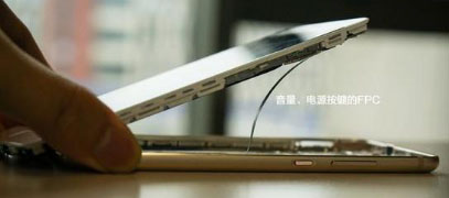 注意音量、電源按鍵的FPC,接口在主板側(cè)。按鍵不直接放在主板上還是有點講究的,因為金屬機身遭遇不慎的話可能會變形,而變形后主板與按鍵(鍵帽)之間容易出現(xiàn)錯位從而影響按鍵手感/功能,因此把按鍵整合在后殼上,再用FPC連接主板,怎么摔按鍵也能按。