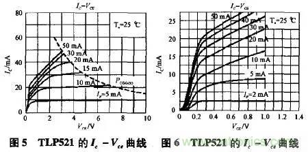2、各種接法的比較在比較之前,需要對(duì)實(shí)際的光耦TLP521的幾個(gè)特性曲線作一下分析。首先是Ic-Vce曲線,如圖5,圖6所示。開(kāi)關(guān)電源中光耦的作用