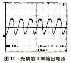 同樣,對(duì)于上面的半橋輔助電源電路,用接法2代替接法1,閉環(huán)不穩(wěn)定,用示波器觀察光耦4腳電壓波形,有明顯的振蕩。光耦的4腳輸出電壓(對(duì)應(yīng)于UC3525的誤差放大器輸出腳電壓),波形如圖11所示,可發(fā)現(xiàn)明顯的振蕩。這是由于這個(gè)半橋電源穩(wěn)態(tài)占空比比較大,按接法2則光耦增益大,系統(tǒng)不穩(wěn)定而出現(xiàn)振蕩。