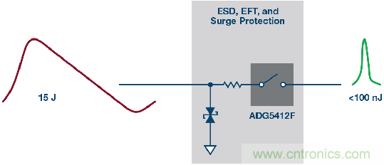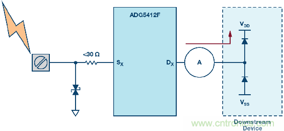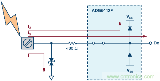 圖4也展示了高壓瞬變事件過程中的各種電流路徑。大部分電流通過TVS器件分流到地(路徑I1)。路徑I2展示的是通過ADG5412F輸出節(jié)點(diǎn)上的內(nèi)部ESD消耗的電流,同時(shí),輸出電壓被箝位于比電源電壓高0.7 V的水平。最后,路徑I3中的電流是下游器件必須承受的剩余電流水平。有關(guān)該保護(hù)電路的更多詳情,請(qǐng)參閱ADI公司應(yīng)用筆記AN-1436。